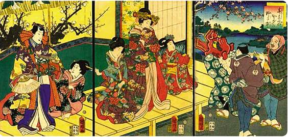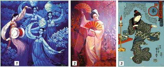 1 - Кунде Ванг. Танець з ліхтариками; 2 - Ольга Стрілецька. Танець Сакури; 3 - Утагава Кунійосі. Танець