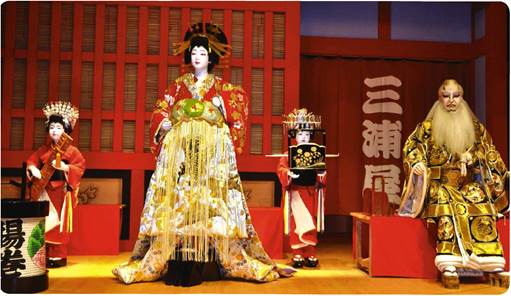 Вистава триває зазвичай понад три години і складається з декількох п’єс, що перериваються невеликими мініатюрами з буденного життя і рафінованими танцями, покликаними підкреслювати піднесеність головної дії.