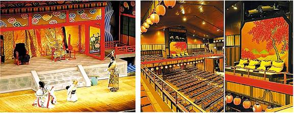 Сцена в Пекінській опері невеликих розмірів, декорації найпростіші, костюми й маски, навпаки, дуже яскраві та виразні.