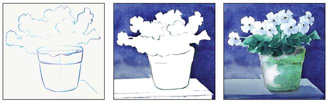 • Добери на палітрі відтінки синього кольору. Покрий фарбами спочатку тло, потім зображення рослини, горщика та столу.