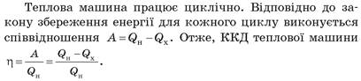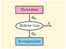 Сучасна техніка дає широкий вибір різних типів теплових двигунів. Але всі вони мають один загальний принцип дії та, відповідно, однакові необхідні елементи. Перш за все потрібний нагрівник, від якого надходитиме певна кількість теплоти Qн. Має бути також робоче тіло, яке безпосередньо виконує роботу А за рахунок отриманої кількості теплоти. Найчастіше як робоче тіло застосовують газ, тому що тільки газ помітно збільшує свій об’єм унаслідок нагрівання, виконуючи при цьому роботу. Іноді (наприклад, у двигунах внутрішнього згоряння) нагрівник «за сумісництвом» є ще й робочим тілом. А ще обов’язково потрібен холодильник, що «забиратиме» кількість теплоти Qx (рис. 29.2). Холодильник — це не відомий вам побутовий пристрій, а просто тіло, температура якого Тх менша від температури нагрівника Тн. Найчастіше роль холодильника виконує навколишнє середовище.