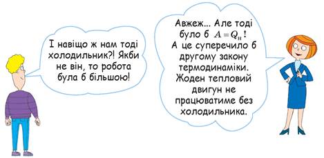 Щоб пояснити наочно роль холодильника, скористаємося простою моделлю теплового двигуна (рис. 29.3): газ під поршнем у вертикальному циліндрі, який почергово приводять у тепловий контакт з нагрівником і холодильником. Отримавши тепло від нагрівника, газ розширяється та піднімає поршень (виконує роботу). Проте після цього потрібно знов опустити поршень, щоб можна було повторити процес. Якщо газ не охолодити перед стисканням, то на цьому етапі доведеться виконати над газом таку саму роботу, яку він виконав під час розширення. Інакше кажучи, доведеться під час стискання газу витратити всю енергію, отриману під час розширення цього газу. Якщо ж температуру газу попередньо знизити, застосувавши холодильник, то тиск газу зменшиться і стискати його буде легше.