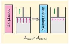 Рис. 29.3. Проста модель теплового двигуна: завдяки використанню холодильника під час стискання газу витрачають менше енергії, ніж отримують під час розширення