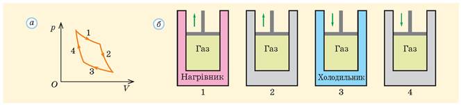 Рис. 29.4. Цикл Карно: а — графік циклу в координатах р, V; б — етапи процесу: 1 — ізотермічне розширення за температури нагрівника; 2 — адіабатне розширення з охолодженням до температури холодильника; 3 — ізотермічне стискання за температури холодильника; 4 — адіабатне стискання до початкового стану (Сірим умовно показано теплоізоляцію.)