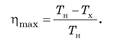 ККД ідеальної теплової машини, яка працює за циклом Карно, залежить тільки від температур нагрівника Тн та холодильника Тх. Цей ККД є максимально можливим за певних значень Тн, Тх: