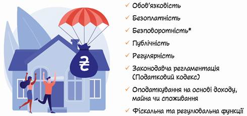 Розгляньмо основні характеристики податків (мал. 48). Саме ці характеристики визначають природу податків та їхню роль у фінансовій системі держави.