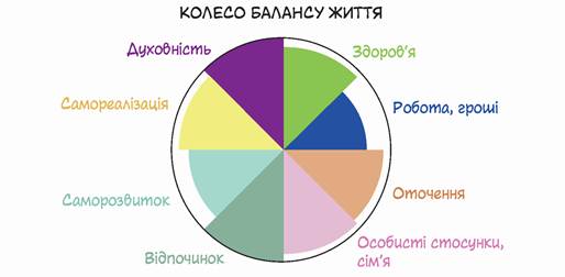 На аркуші паперу намалюйте велике коло та поділіть його на вісім секторів, які відповідають різним сферам життя: здоров’я, робота / гроші, оточення, особисті стосунки / сім’я, відпочинок, саморозвиток, самореалізація, духовність (мал. 54). Оцініть задоволеність кожною сферою від 1 до 10, де 10 - повністю задоволений, 1 - не задоволений, відповідно зафарбовуючи сектор. Проаналізуйте, які сфери найважливіші для вас у контексті майбутньої роботи. До того ж не забувайте про свої цінності, які теж впливають на цей вибір.