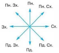 Горизонт. Видиму частину земної поверхні у вигляді кола, на яке нібито спирається небосхил, називають горизонтом (мал. 18). Лінію злиття небосхилу й горизонту називають лінією горизонту. Ви вже вивчали основні й проміжні сторони горизонту. Пригадайте їх. Основні сторони горизонту — північ, південь, захід, схід. Проміжними сторонами горизонту є: північний схід, південний схід, південний захід, північний захід (мал. 19).