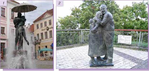 Мал. 9.3. 1. «Сміються, плачуть солов’ї і б’ють піснями в груди... Цілуй, цілуй, цілуй її, — Знов молодість не буде!»1 На світлині — фонтан «Поцілунок студентів», Тарту, Естонія. 2. «Буду шукать тебе всюди, Линуть до тебе...»2. На світлині — пам’ятник на честь українки Мокрини Юрзук та італійця Луїджі Педутто, Київ, Україна