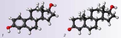 Мал. 9.5. Модель молекул тестостерону С19Н28О2 — основного чоловічого статевого гормона (1) естрадіолу С18Н24О2 — основного жіночого статевого гормона (2)