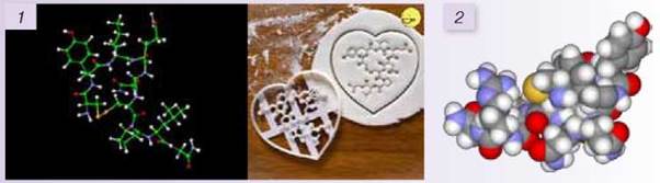 Мал. 9.7. Моделі молекул окситоцину C43H66N12O12S2 (1) та вазопресину C46H65N15O12S2 (2)