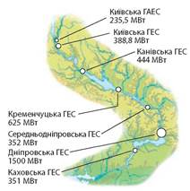 • гідроелектростанції: каскад ГЕС на Дніпрі: Київська, Канівська, Кременчуцька, Середньодніпровська, Дніпровська, Каховська, Дністровська, Ташлицька;