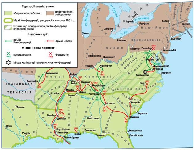 • Громадянська війна 1861—1865 рр. призвела до розв'язання конфлікту на користь Півночі. Вона закріпила її провідну роль в економічному й політичному житті країни.