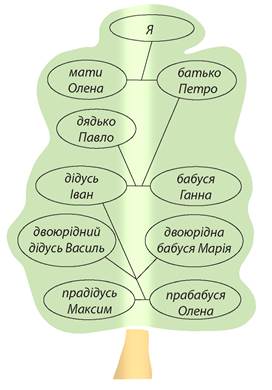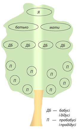 На верхівці дерева розташуйте свою фотографію. Нижче подайте зображення своїх батьків. Ще нижче, під ними, розмістіть фотографії бабусі та дідуся з боку батька, а поряд, дещо праворуч, — бабусі та дідуся з боку матері. Так само рядком нижче покладіть фотографії своїх прабабусь і прадідусів, що є батьками ваших бабусь і дідусів. Таким чином ви зможете визначити чотирьох прабабусь і чотирьох прадідусів. Це буде просте родинне дерево. Спираючись на нього, можна намалювати генеалогічне дерево. Воно показує, як зростала ваша родина починаючи від одного предка. Припустімо, що це буде той із ваших прадідусів, прізвище якого має ваша сім’я.