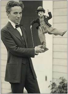 Чарлі Чаплін тримає ляльку популярного кіногероя. 1918 р.