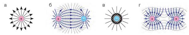 Рис. 20.2. Силові лінії поля точкових зарядів: а) позитивного; б) негативного; в) двох різнойменних; г) двох однойменних