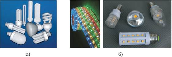 Рис. 32.3. Енергозберігаючі лампи: а) газорозрядна лампа низького тиску; б) LED-лампи