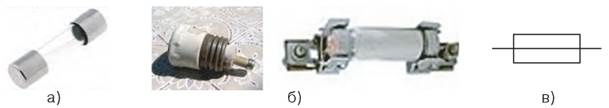 Рис. 32.4. Плавкі запобіжники: а) плавкий запобіжник; б) утримувачі запобіжників; в) позначення плавких запобіжників на електричних схемах