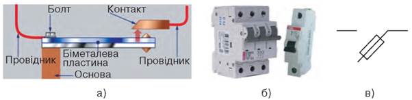 Рис. 32.5. Автоматичні вимикачі: а) під час вигинання біметалевої пластини контакт розмикається; б) автоматичні запобіжники; в) позначення автоматичних вимикачів (запобіжників) на електричних схемах