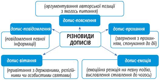 552. Ознайомтеся зі схемою на с. 224. Сформулюйте запитання, на які в ній є відповіді. Підготуйте розповідь про допис як жанр мовлення.