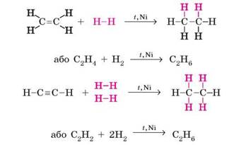 Ще один метод одержання алканів ви розглянули в 9 класі — гідрування (гідрогенізація) ненасичених вуглеводнів — приєднання водню до етену й етину та їхніх гомологів під час нагрівання за наявності каталізатора: