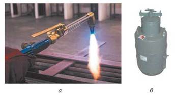 Мал. 12.2. Полум'я ацетиленокисневого пальника (а) та балон для одержання ацетилену з кальцій карбіду CaC2 перед подачею його в пальник — генератор ацетилену (б)