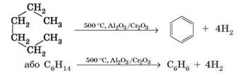 а також під час дегідроциклізації (дегідрування з одночасним замкненням циклу) гексану: