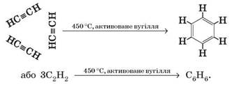2. Тримеризація етину (реакція Зелінського). Також бензен у промисловості добувають з етину. Під час пропускання етину над розпеченим активованим вугіллям три молекули етину сполучаються в одну молекулу бензену: