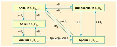 Ви вже помітили, що, маючи сполуку одного класу, можна одержати сполуки іншого класу. Так, між вуглеводнями існує взаємозв'язок (генетичний ланцюг), зображений на схемі. Ґрунтуючись на ньому, можна здійснювати різні перетворення.