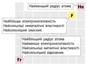 Отже, властивості хімічних елементів та їхніх сполук періодично змінюються, що значною мірою зумовлено періодичністю змін у будові електронних оболонок атомів. А Францій та Флуор — рекордсмени за багатьма властивостями (мал. 4.3).