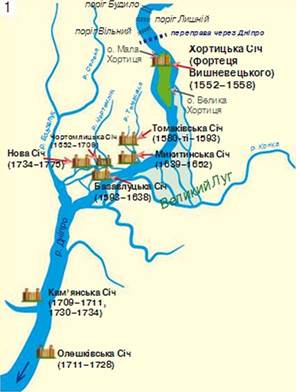 1 — схематична карта Запорозьких Січей
