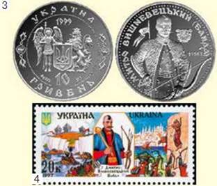 3 — пам’ятна українська монета, присвячена Д. Вишневецькому; 4 — поштова марка України «Дмитро Вишневецький (Байда)»