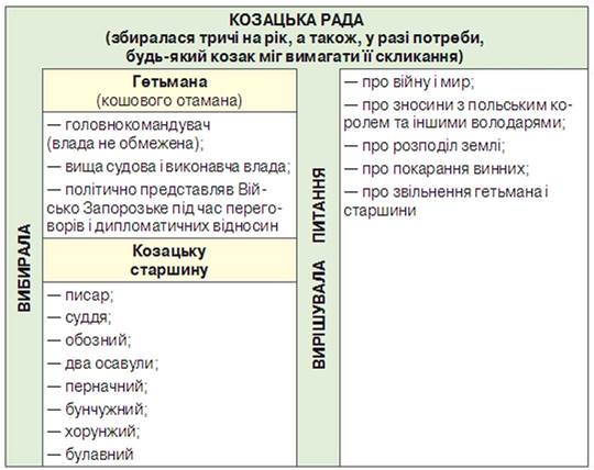 На основі схеми доведіть, що Запорозька Січ була козацькою республікою. Які органи керували Січчю? Як їх формували? Які функції кожного з них?
