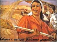 Напис на радянському агітаційному плакаті: «Зберемо з цілини багатий врожай!»