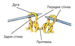 Для в'язання основних видів петель треба знати будову петлі (мал. 4.1). Петля складається з таких частин: дуга — це верхня горизонтальна частина петлі, що лежить на спиці; передня стінка — це вертикальна частина петлі, що розташована перед спицею; задня стінка — це вертикальна частина петлі, що розташована за спицею; протяжка (перемичка) — нитка, що сполучає знизу дві сусідні петлі в одному ряду.