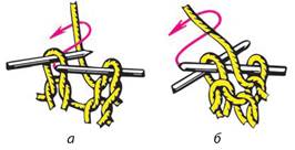 Мал. 4.2. Схеми вив'язування основних петель за передню стінку (класичний спосіб): а — лицьова петля; б — виворітна петля