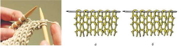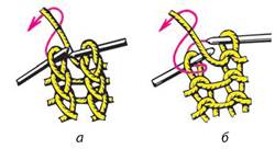 Мал. 4.3. Схеми вив'язування основних петель за задню стінку («бабусина» петля): а — лицьова петля; б — виворітна петля