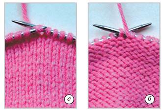 Мал. 4.6. Розташування нитки під час в'язання: а — лицьовими петлями; б — виворітними петлями