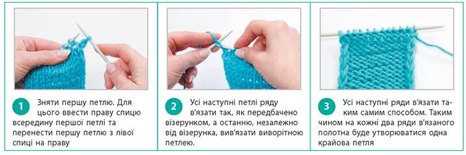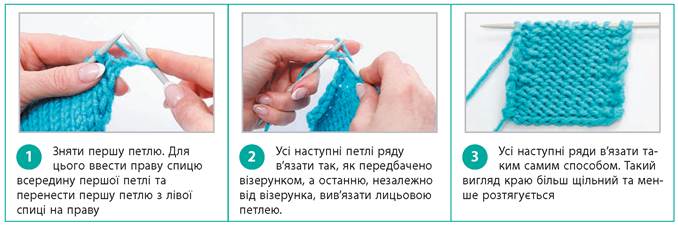 Важливим під час в'язання спицями є утворення крайових петель правого та лівого боку полотна. Від способу в'язання крайових петель і кінцевого ряду полотна залежить зовнішній вигляд виробу.