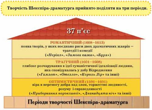 - 4. Уважно розгляньте схему «Періоди творчості Шекспіра-драматурга». Поясніть, чому кожний з періодів одержав саме таку назву.