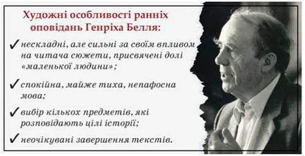 Генріха Белля визнано майстром короткого оповідання. Як і А. Чехов, він писав про так звану «маленьку», звичайну людину. У чому ж полягають секрети майстерності німецького письменника? Українська дослідниця Кіра Шахова відзначала, що його мова спокійна, майже тиха, ніякої екзальтації1 чи пафосу, жодних жахливих або екзотично яскравих картин чи образів. Ця манера викладу настільки сильно впливає на читача, що художній твір немов оживає в його душі.