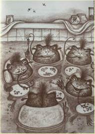 Я зайшов на кухню й завмер від подиву. На підвіконні, біля горщиків з бабусиними калачиками, сиділи дві блакитні ротаті ропухи й лупали банькатими очима. Щоправда, за розміром вони були разів у десять менші від синьомордів, але в однієї жаби на голові стирчала чимала ґуля.