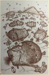 — Друзі, — замислено мовив тато, — дивлячись на вкриту сплячими синьомордами пустелю, — якщо зараз ми почнемо перетягати цих пузатих довголапів до нашої піраміди, то не впораємося й до вечора.