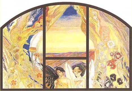 У центральній частині загадкова композиція: худорлявий, темноволосий юнак із чорними крилами, що грає на сопілці якусь журну мелодію, і тендітна дівчина з білими крилами ніби повільно проходять повз «велике вікно», що підкреслюється поясним зображенням фігур і темними смугами, які поділяють усе панно на чотири частини.