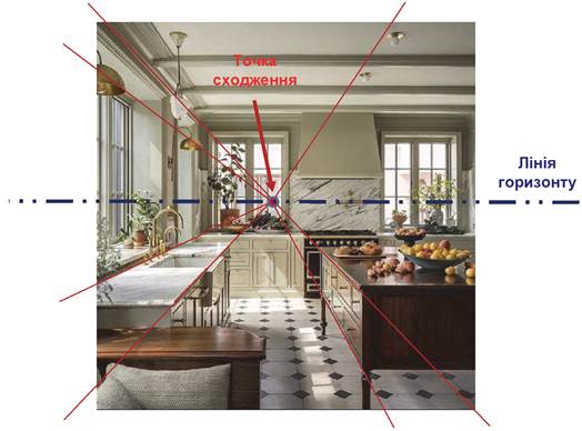 Стоячи посеред кімнати і дивлячись на одну із стін, ти помічаєш, що стіна навпроти й усі площини, розташовані фронтально до тебе, залишаються прямокутними. А всі інші стіни та об’єкти біля них деформуються — перетворюються на трапеції. Вони не втратили своєї форми, проте такими їх бачить наше око! Тож і малювати їх треба теж так, щоб глядач відчув себе на твоєму місці і побачив їх зміненими. Усі лінії, спрямовані від тебе до протилежної стіни, збігатимуться в одну точку — точку сходження. Кожен наступний віддалений елемент буде, відповідно, меншим на малюнку за попередній.