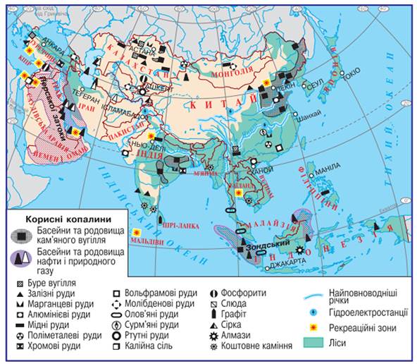 • Проаналізувавши карту природних ресурсів Азії (мал. 71), визначте, які країни мають найбагатшу мінерально-сировинну базу та які виробництва можуть розвиватися на її основі.
