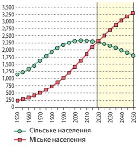 Мал. 72. Динаміка міського та сільського населення Азії (1950-2050 рр.)