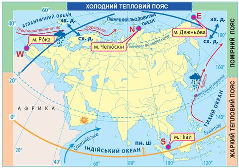 Завдання. 1. За картою-схемою з’ясуйте, які з ліній градусної сітки перетинають Євразію і порівняйте з Північною Америкою: а) екватор; б) 0° меридіан (Гринвіч); в) 180° меридіан; г) Північний тропік; д) Північне полярне коло. 2. Установіть, у яких півкулях Землі розміщена Євразія та порівняйте з Північною Америкою. 3. Визначте назви крайніх точок Євразії: північної (N), південної (S), західної (W), східної (E); позначте їх на контурній карті. Розрахуйте, як далеко (у градусах і км) до Північного полюсу від крайньої північної точки материка та як далеко до екватора від крайньої південної точки. Результати розрахунків порівняйте з Північною Америкою. 4. Поясніть, як впливають на природу Євразії її величезні розміри, а також те, що її перетинають одночасно Північний тропік та Північне полярне коло. Порівняйте з Північною Америкою. 5. Установіть, які океани та в яких частинах омивають Євразію. Які теплі й холодні океанічні течії існують біля берегів материка? Який вони мають вплив на природу узбереж? Поясніть, за що течію Гольфстрим називають «трубою парового опалення» Європи. 6. Визначте, з якими материками межує Євразія та пригадайте, якими водними об’єктами проходить ця межа. 7. Проаналізуйте особливості географічного положення Євразії та поясніть, до природних умов якого із сусідніх материків - Північної Америки чи Африки - більш подібні природні умови Євразії.