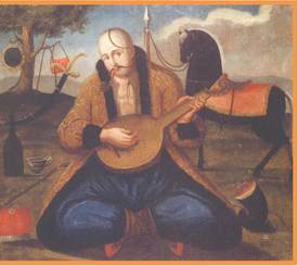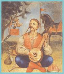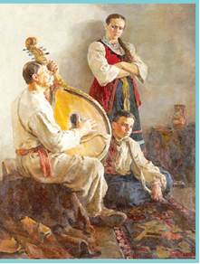 Розглянь картину, на якій зображено ідеалізований образ козака — захисника українського народу. Опиши свої враження від цього твору та засоби його виразності. Який музичний інструмент зображено на картині? Якою музикою тобі хотілося б її озвучити?