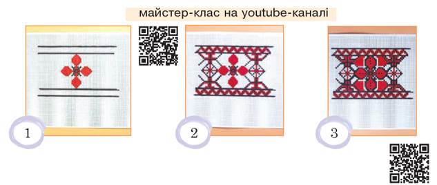 Українській вишивці притаманний яскравий і водночас витончений орнамент, який допомагає народним майстрам і майстриням надавати виробам композиційної завершеності. Ти вже знаєш, що орнамент може зображувати певні форми рослинного чи тваринного світу, геометричні фігури або фігурки людей. Таким чином, орнаменти поділяють на геометричні, рослинні, зооморфні (основу яких складають стилізовані зображення тварин) та антропоморфні (в основі яких — стилізоване зображення людини). А ще у вишитих узорах збереглися прадавні магічні знаки — їх і зараз відтворюють на полотні як обереги, як коди своєї нації.